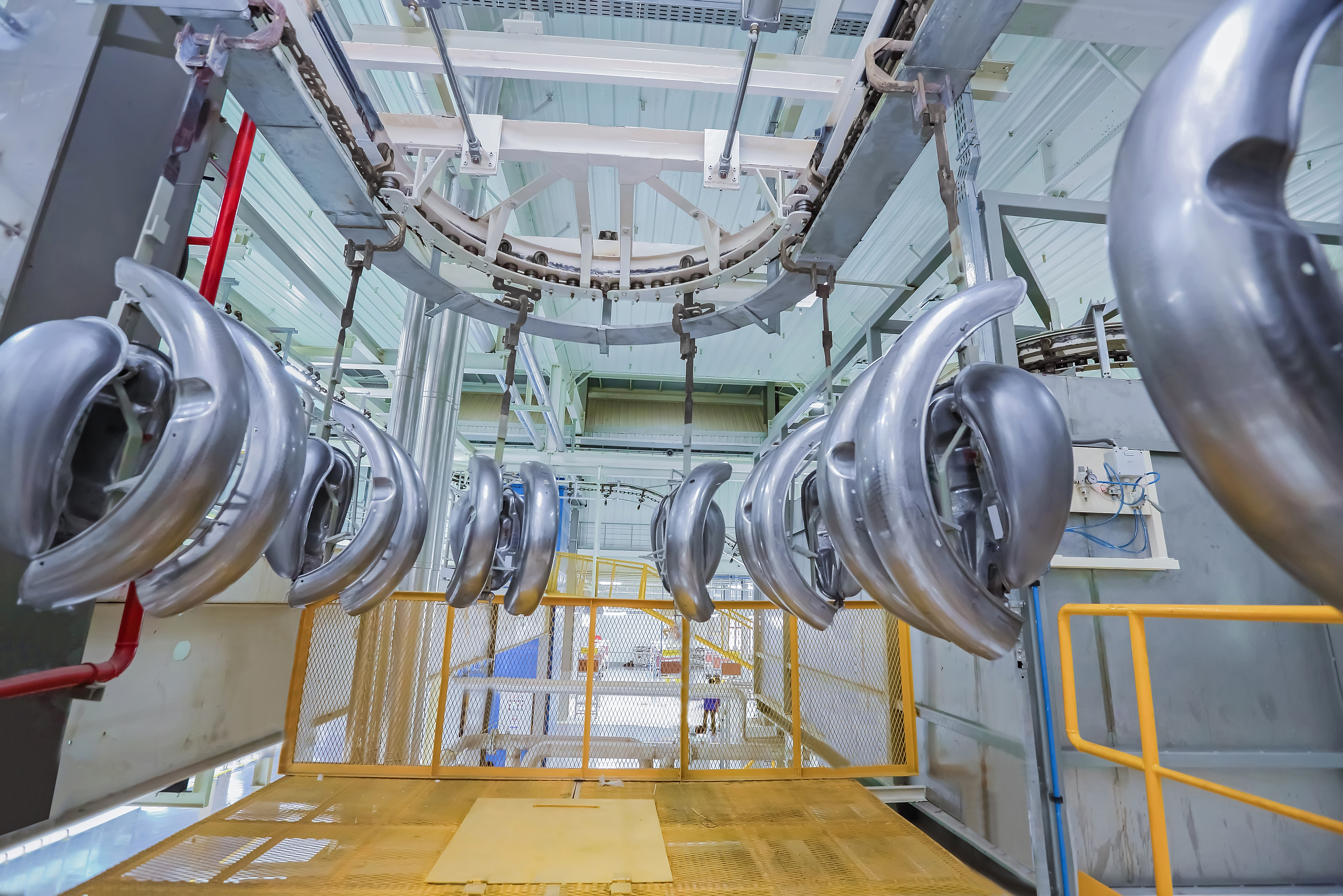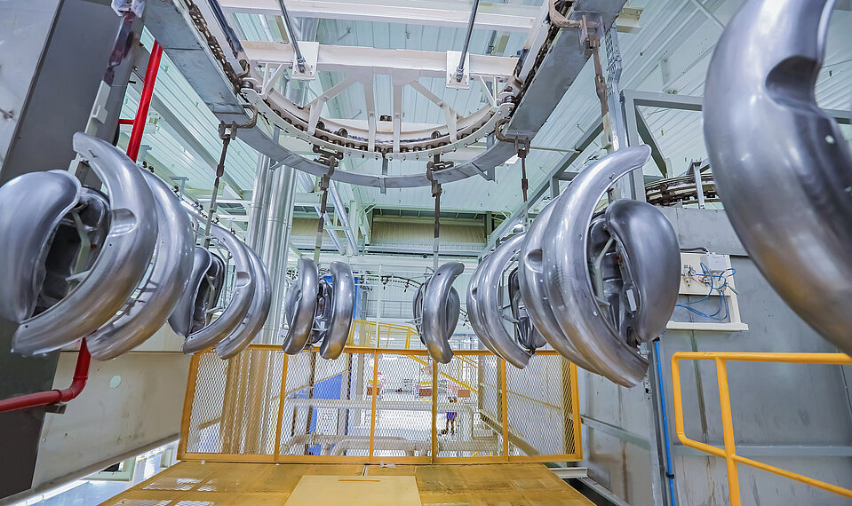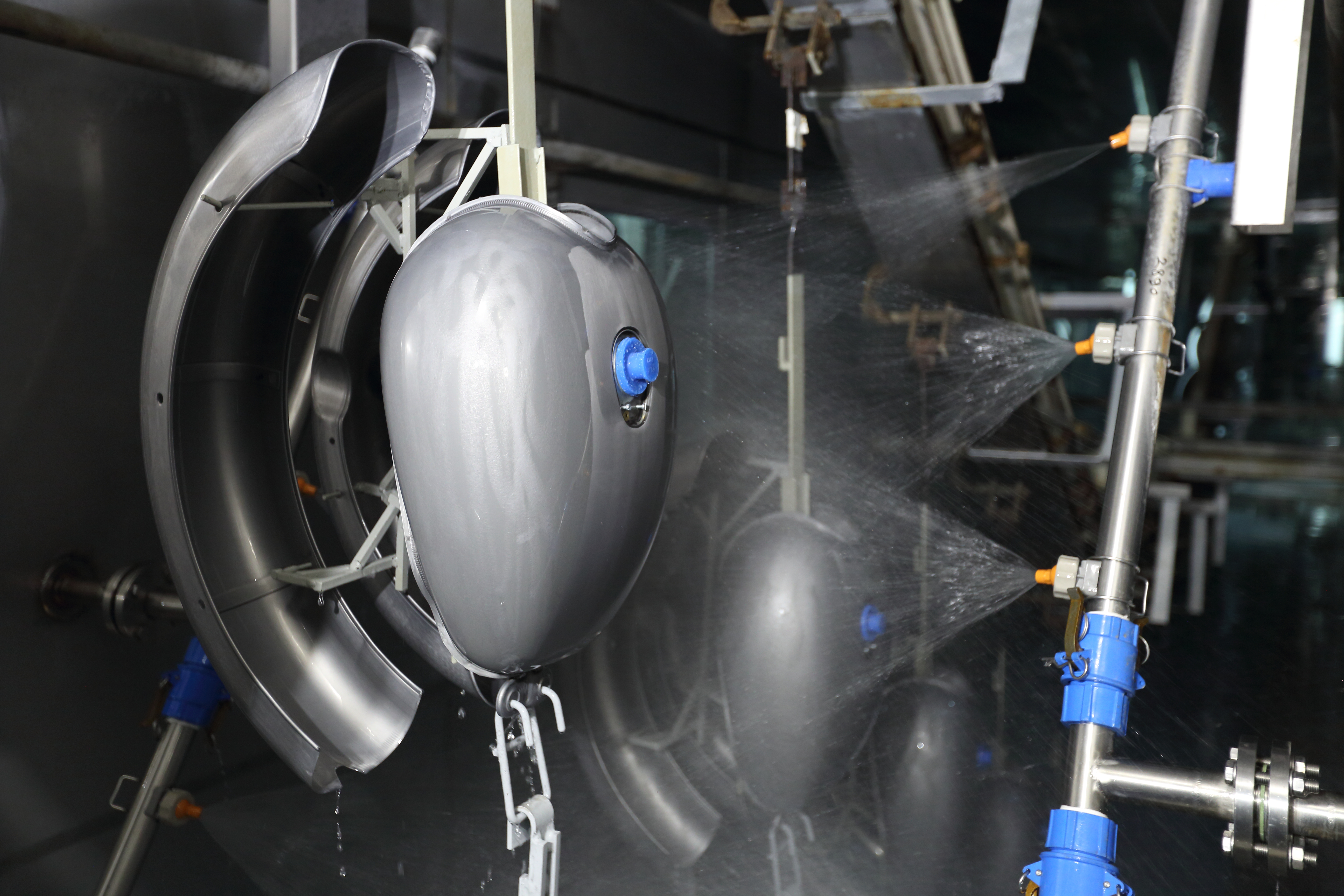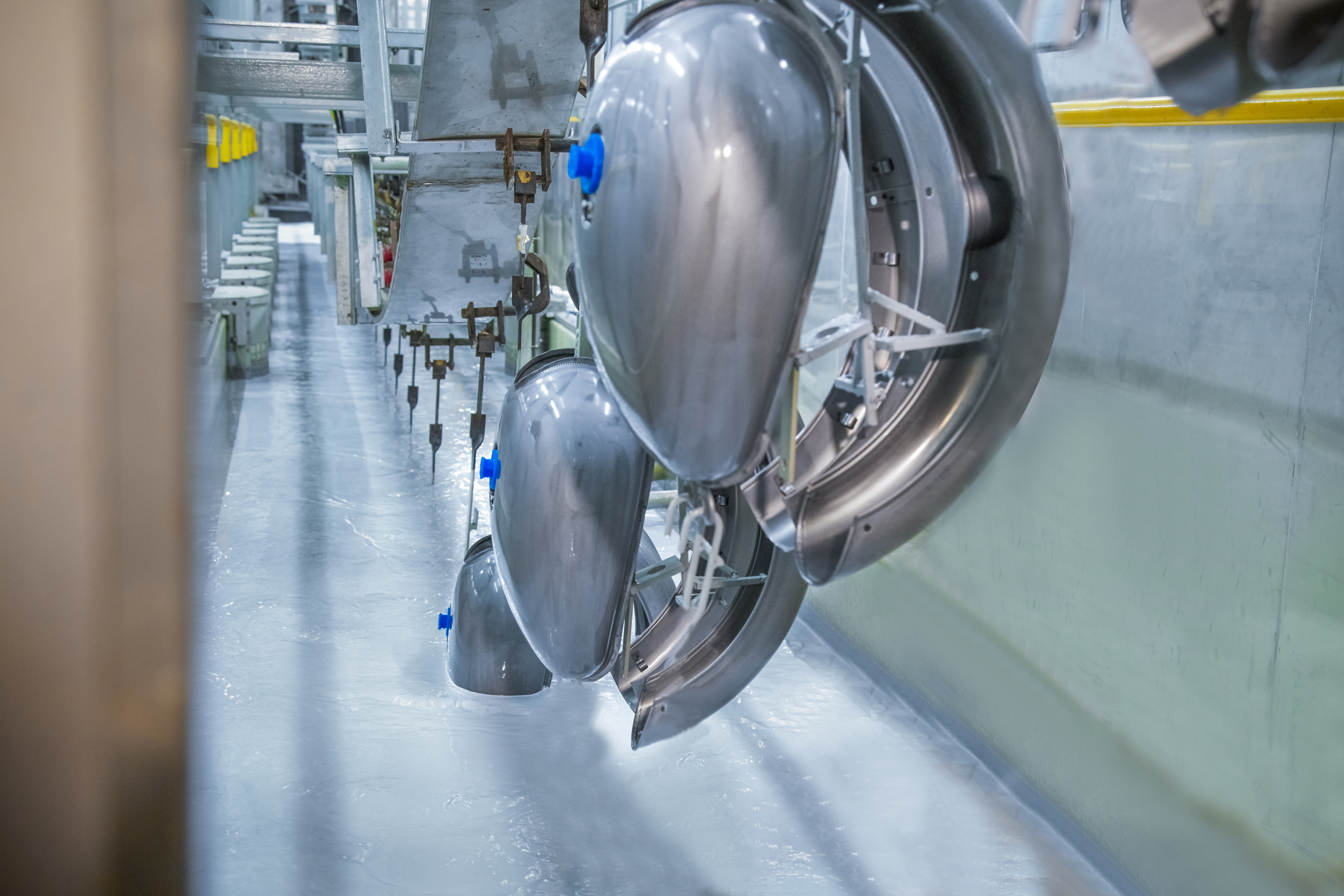 Und der Unterschied zur Automobillackierung? Höhere Stückzahlen in der Zwei- und Dreiradindustrie führen zu höheren Fördergeschwindigkeiten und mehr Overspray. Gleichzeitig ist die Lackierfläche kleiner als bei vierrädrigen Fahrzeugen, was den Prozess anspruchsvoller macht. Zweiradteile sind zudem aerodynamisch geformt und haben komplexe 3D-Profile. Um diesen Anforderungen gerecht zu werden, bietet Dürr DXQ3D on site an, eine Software, die für jedes Teil die optimale Lackierroute ermittelt. Zusätzliche Überwachungssoftware macht den Prozess effizienter und nachhaltiger.