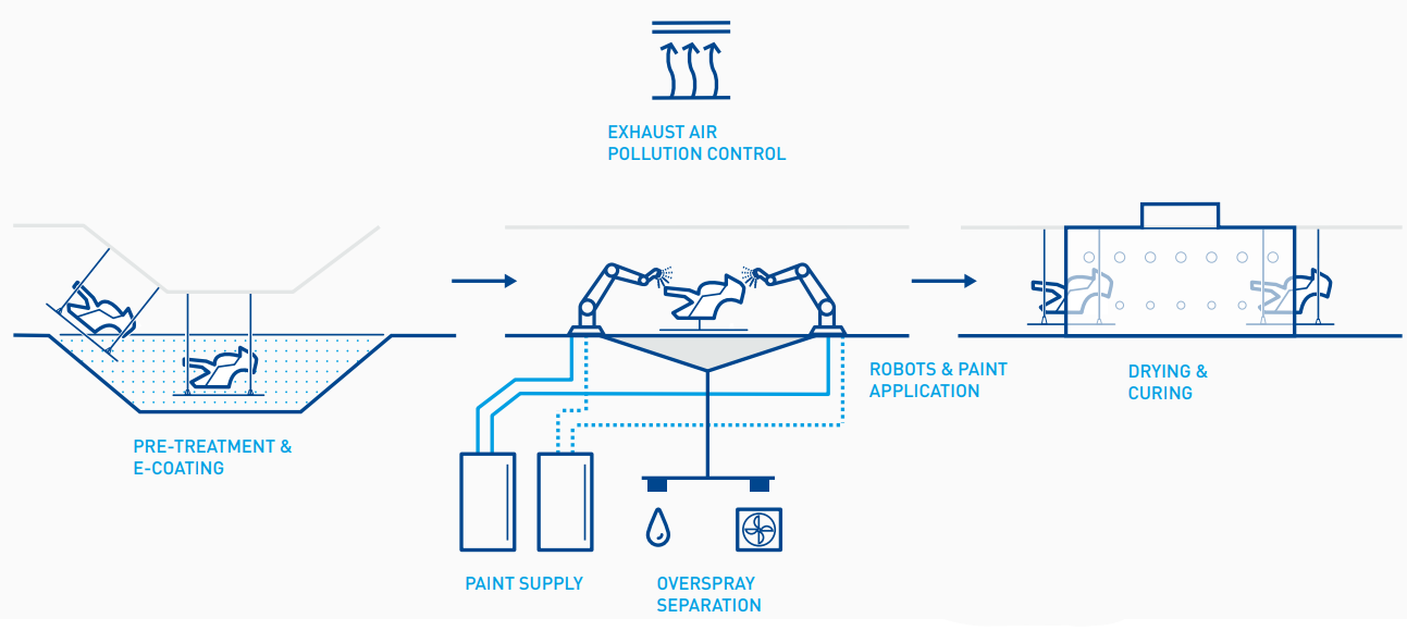 Beim Vergleich der Lackierprozesse für Autos, Motorräder und Tuk-Tuks gibt es auf den ersten Blick keine großen Unterschiede. Der Prozess beginnt mit der Vorbehandlung und der kathodischen Tauchlackierung, um die Karosserie vor Korrosion und Rost zu schützen. Nach dem Durchlaufen des Trockners beginnt der Lackierprozess. Dürr kümmert sich sowohl um die Farbversorgung als auch um den Lackauftrag – entweder automatisch oder manuell. Je nach Kundenwunsch kann der Overspray nass oder trocken abgeschieden werden, wobei EcoDry X eine umweltfreundliche Technologie darstellt. Dürr bietet der Zwei- und Dreiradindustrie somit schlüsselfertige Lackieranlagen oder auf Wunsch einzelne Prozessschritte an.