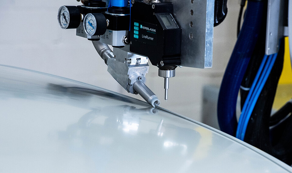 Für Fahrzeugdächer mit aufgeklebten Panorama-Glasdächern bietet Dürr ebenfalls eine smarte Lösung: Das sogenannte „Skiving“, also das automatisierte Abrakeln der Sealingnaht, ersetzt die manuelle Bearbeitung. Eine eigens entwickelte Rakel, aufgesetzt auf die EcoGun2 3D, flacht die PVC-Naht exakt ab. So lässt sich das Glasdach oder auch die Windschutzscheibe zuverlässig und passgenau verkleben.