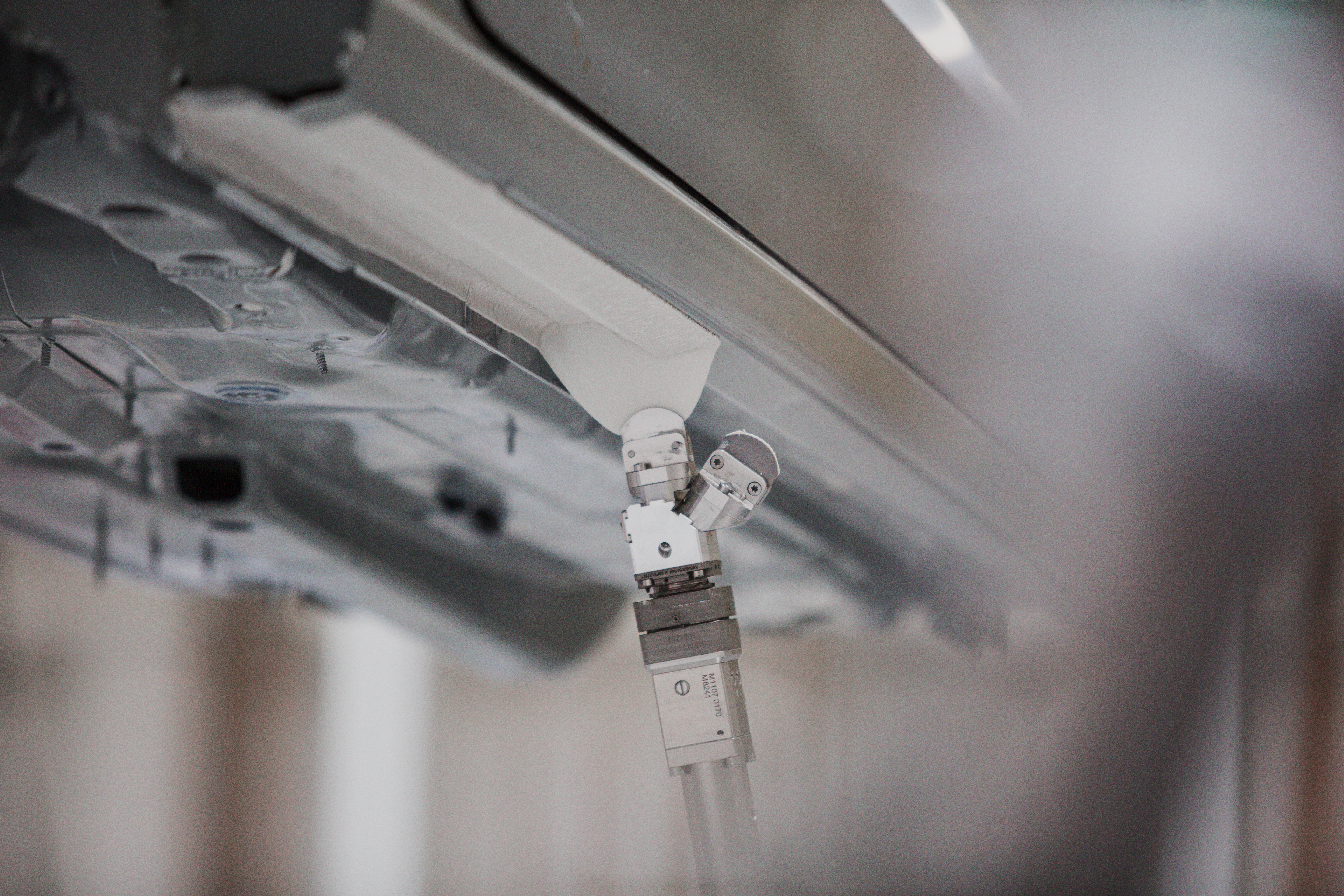 Was heute noch meistens manuell erledigt wird – etwa das Maskieren kleiner Flächen oder das Schützen der Bolzen mit Hülsen – lässt sich automatisiert lösen. Schon beim ersten Schritt des Sealing-Prozesses, dem Underbody Sealing, zeigt sich, welches Potenzial darin steckt: Mit EcoJetAC entfällt das zeitaufwendige Abkleben ebenso wie das spätere Entfernen von Klebern und Hülsen. Stattdessen übernehmen Dürrs Luftdüsen die Arbeit – sie reinigen den Unterboden automatisiert mit Druckluft und befreien Bolzen zuverlässig von überschüssigem PVC.
