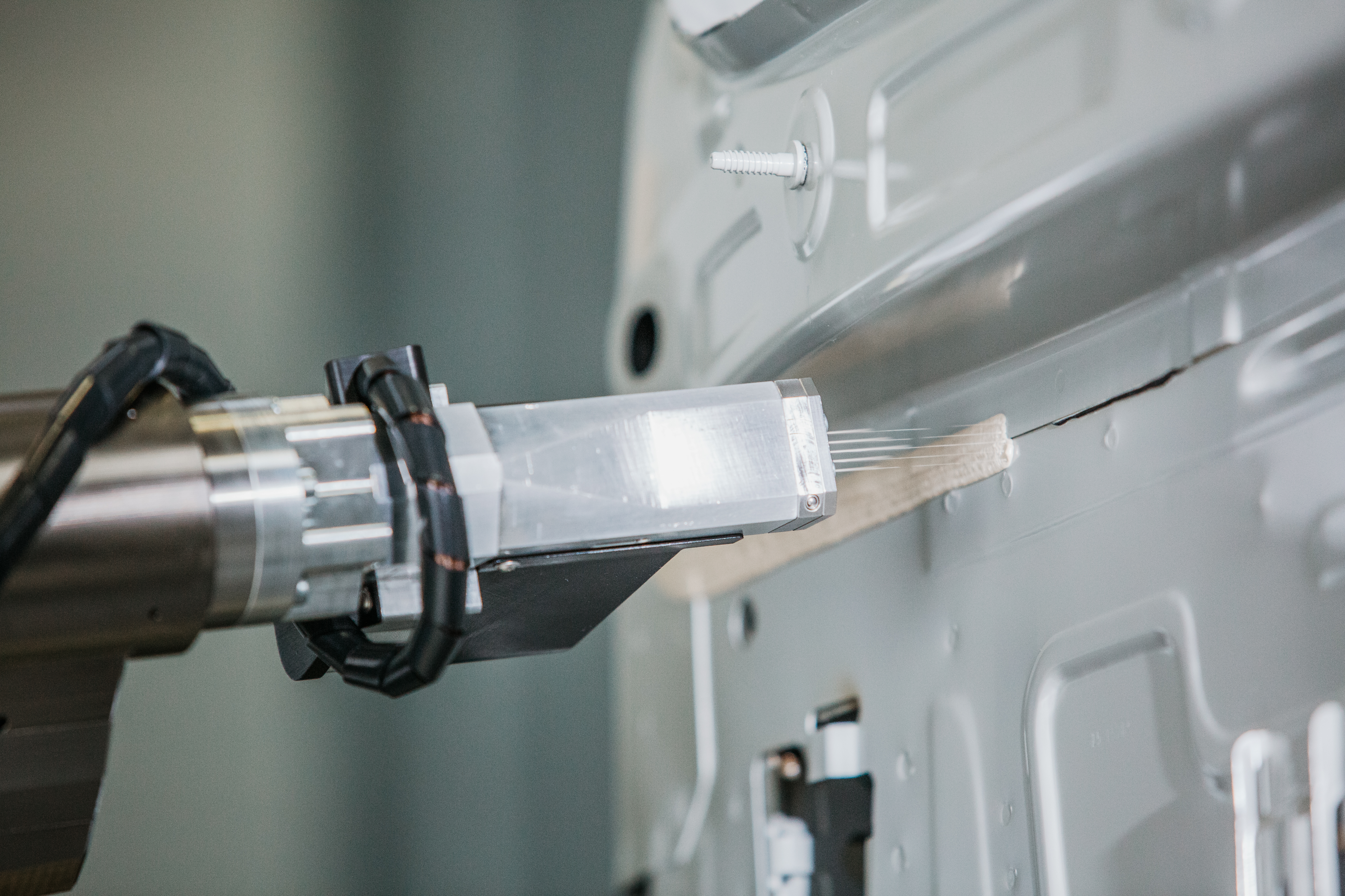 Auch für die Dachnaht-Applikation – also der Verbindung zwischen Dach und Seitenwand – ermöglicht der Werkzeugkasten von Dürr einen durchgängig automatisierten Ablauf. Eine spezielle Vakuum-Düse übernimmt das Glätten der Naht. Wie ein Staubsauger saugt sie überschüssiges Material ab, ohne dass die Naht noch manuell nachgearbeitet werden muss. Sie ist anschließend so glatt, dass sie nach dem Lackieren kaum noch sichtbar ist.