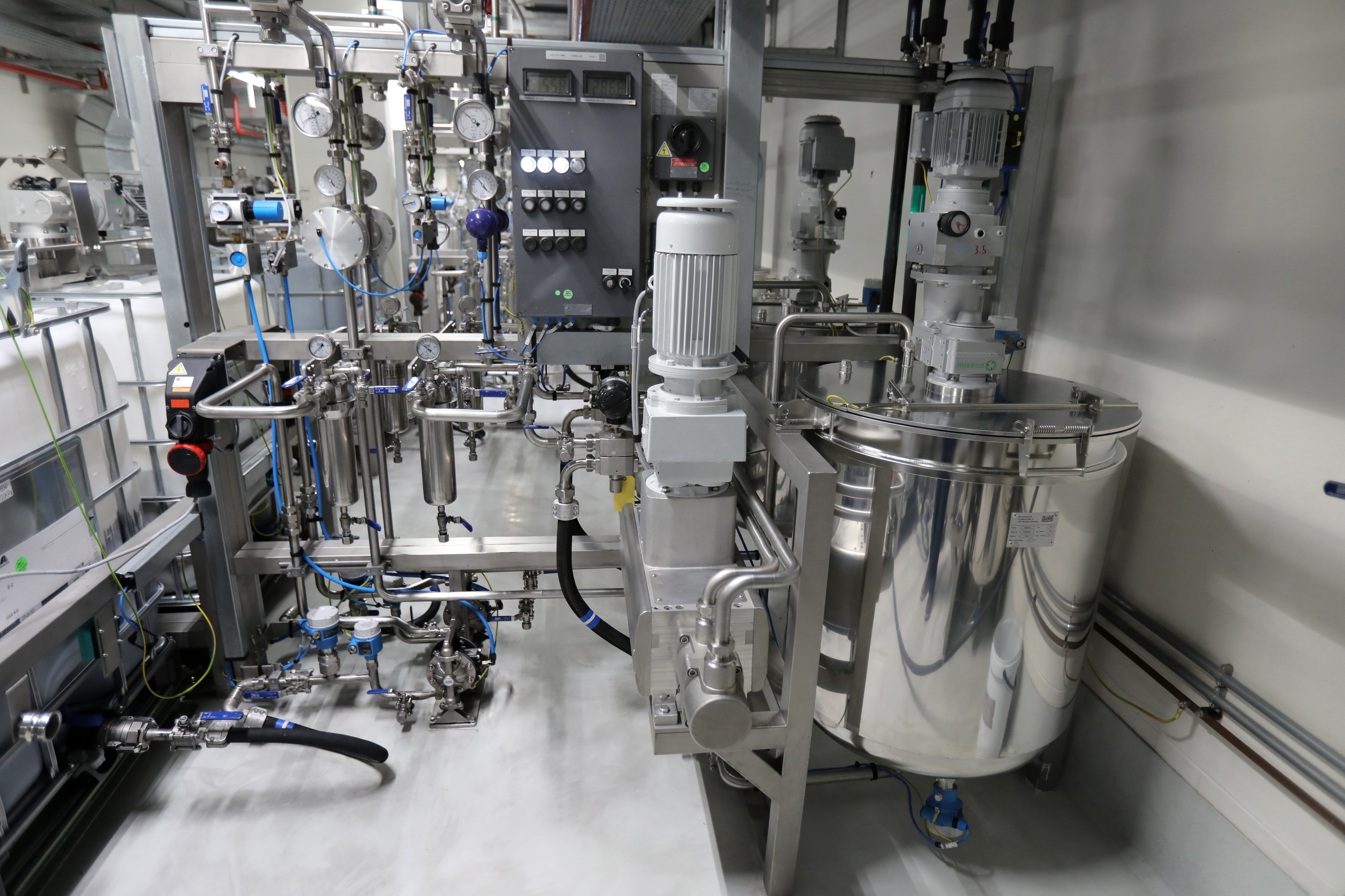 Der Lack wird in großen Gebinden angeliefert und anschließend in speziell angefertigte Behälter umgefüllt. Dürr hat hierfür Edelstahlbehälter entwickelt. Optional können diese Behälter auch doppelwandig ausgeführt werden, um das Lackmaterial zu temperieren. Neben den erforderlichen Prozessanschlüssen und der Sensorik für die Füllstandsmessung, sind diese Behälter mit Rührwerken ausgestattet, damit sich das Lackmaterial nicht absetzen kann. So wird sichergestellt, dass der Lack seine Qualität beibehält.