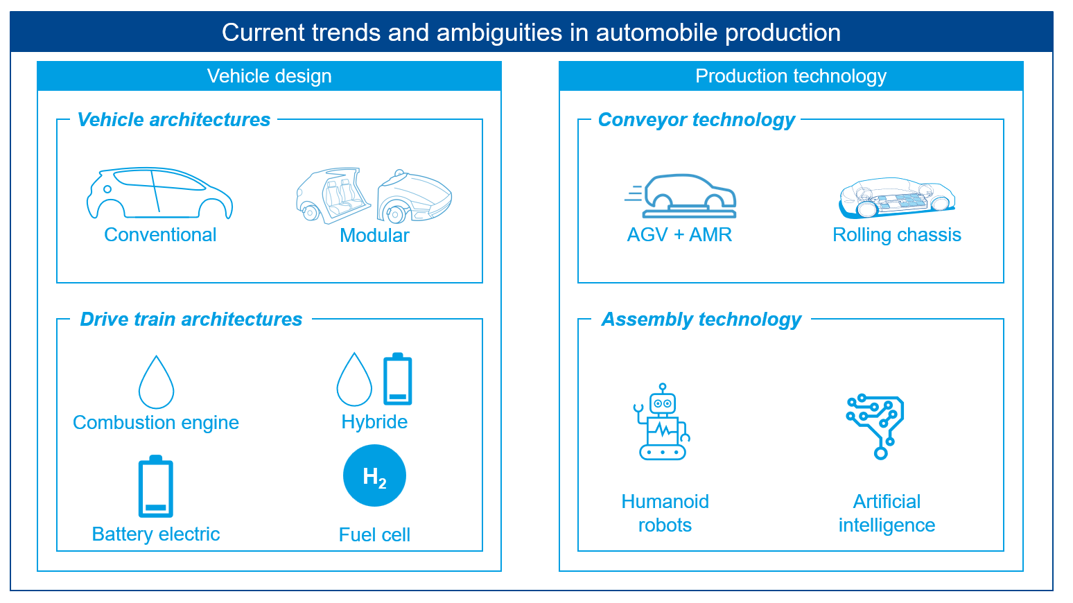 Automotive production is undergoing a significant transformation. One major driver is the intense cost pressure manufacturers face to remain competitive. At the same time, global competition is noticeably increasing. Companies are facing a high degree of uncertainty – such as fluctuating unit volumes and expanding product variants. Today's production landscape is characterized by enormous variety, which greatly increases complexity. These challenges are forcing companies to find new solutions.