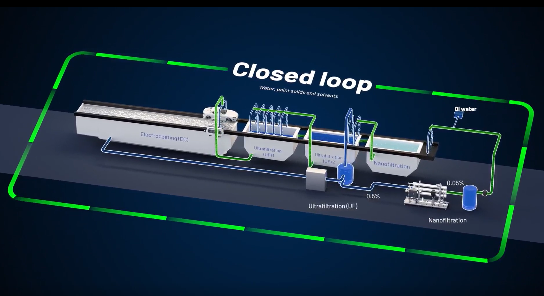 The nanofiltrate is collected in a separate tank and fed into the final rinse stage via spray rings – instead of fresh DI water. From there, it is cascaded: it flows from the final rinse stage to the previous one. Finally, it returns to the cathodic dip coating tank, where it is reintegrated into the process.
